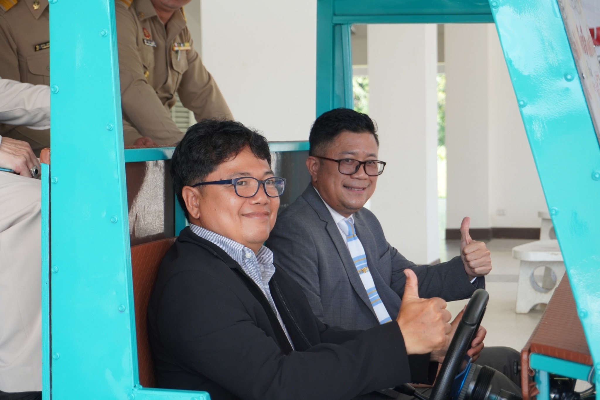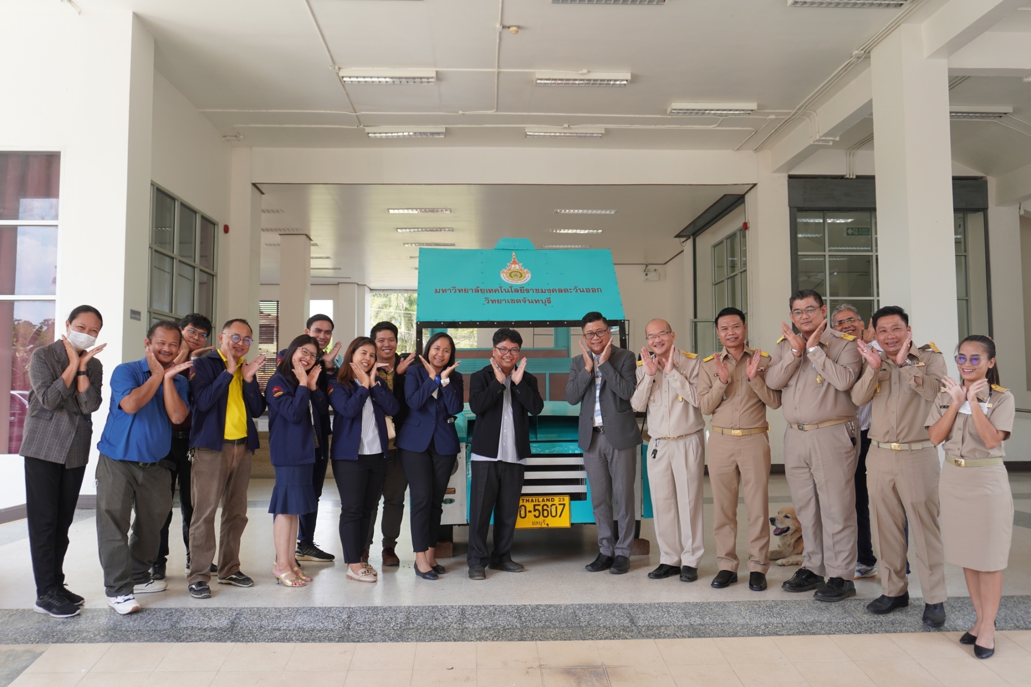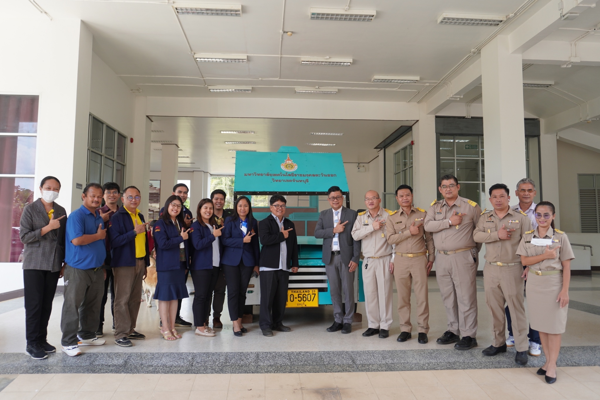 รอง.ผอ.ไพฑูลย์ สุขผลานันท์ รองผู้อำนวยการฯ พร้อมด้วยคณาจารย์อีก 3 ท่าน , ผู้อำนวยการสำนักงานวิทยาเขตจันทบุรี และผู้อำนวยการโครงการจัดตั้งฯ ในการมอบรถต่อพ่วง