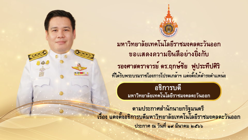 ตามประกาศสำนักนายกรัฐมนตรี เรื่อง แต่งตั้งอธิการบดีมหาวิทยาลัยเทคโนโลยีราชมงคลตะวันออก