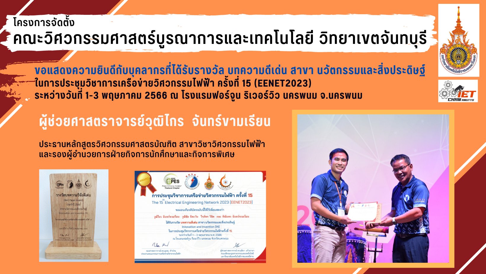 ขอแสดงความยินดีกับ ผู้ช่วยศาสตราจารย์วุฒิไกร จันทร์ขามเรียน ประธานหลักสูตรวิศวกรรมศาสตรบัณฑิต สาขาวิชาวิศวกรรมไฟฟ้า และรองผู้อำนวยการฝ่ายกิจการนักศึกษาและกิจการพิเศษที่ได้รับรางวัล บทความดีเด่น สาขา นวัตกรรมและสิ่งประดิษฐ์ ในการประชุมวิชาการเครือข่ายวิศวกรรมไฟฟ้า ครั้งที่ 15 (EENET2023) ระหว่างวันที่ 1-3 พฤษภาคม 2566 ณ โรงแรมฟอร์จูน ริเวอร์วิว นครพนม จ.นครพนม