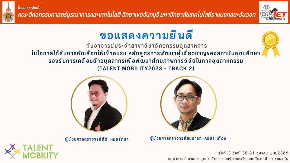 ขอแสดงความยินดี กับอาจารย์ประจำสาขาวิชาวิศวกรรมอุตสาหการทั้ง 2 ท่าน ในโอกาสได้รับการคัดเลือกให้เข้าอบรม หลักสูตรการพัฒนาผู้เชี่ยวชาญของสถาบันอุดมศึกษา