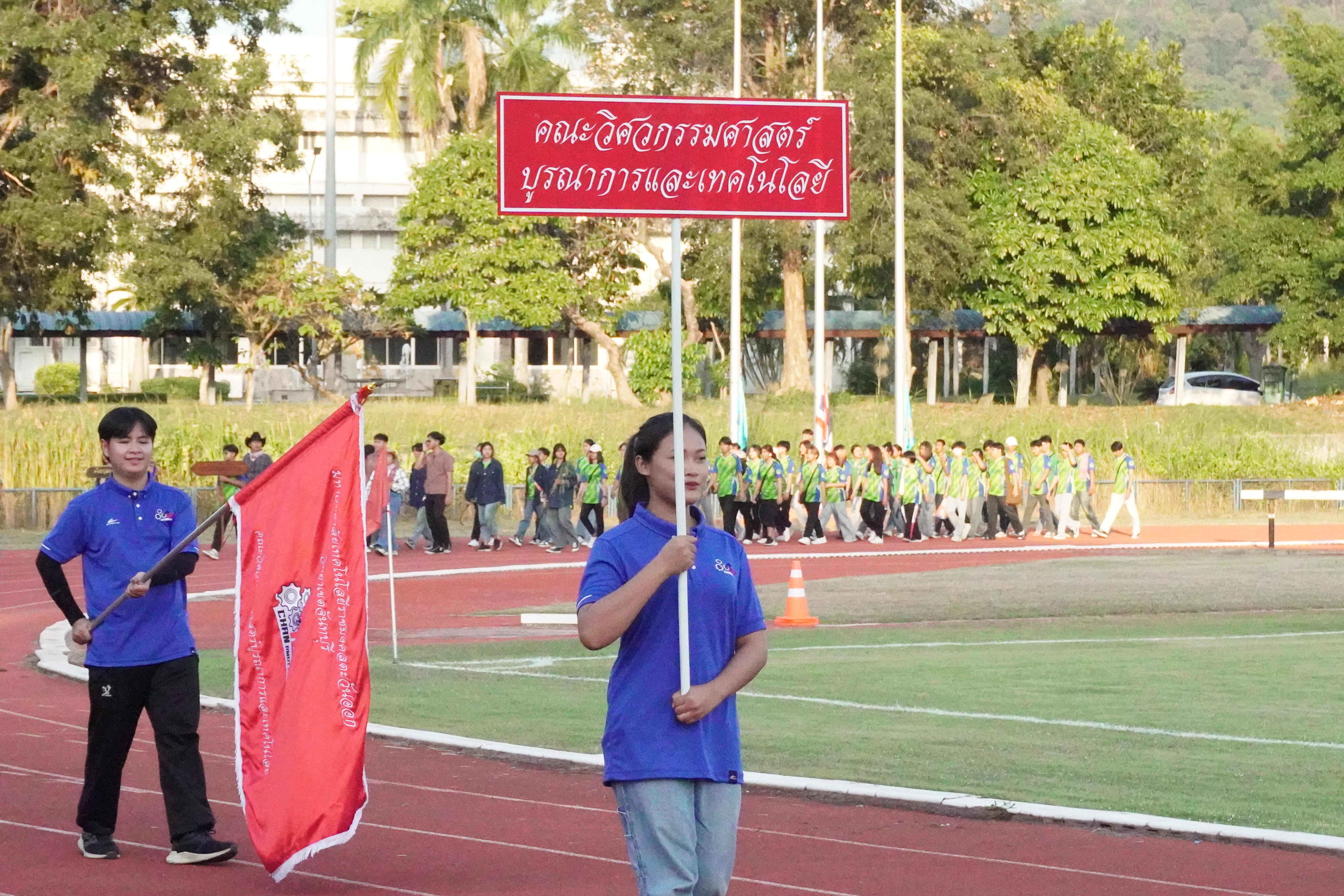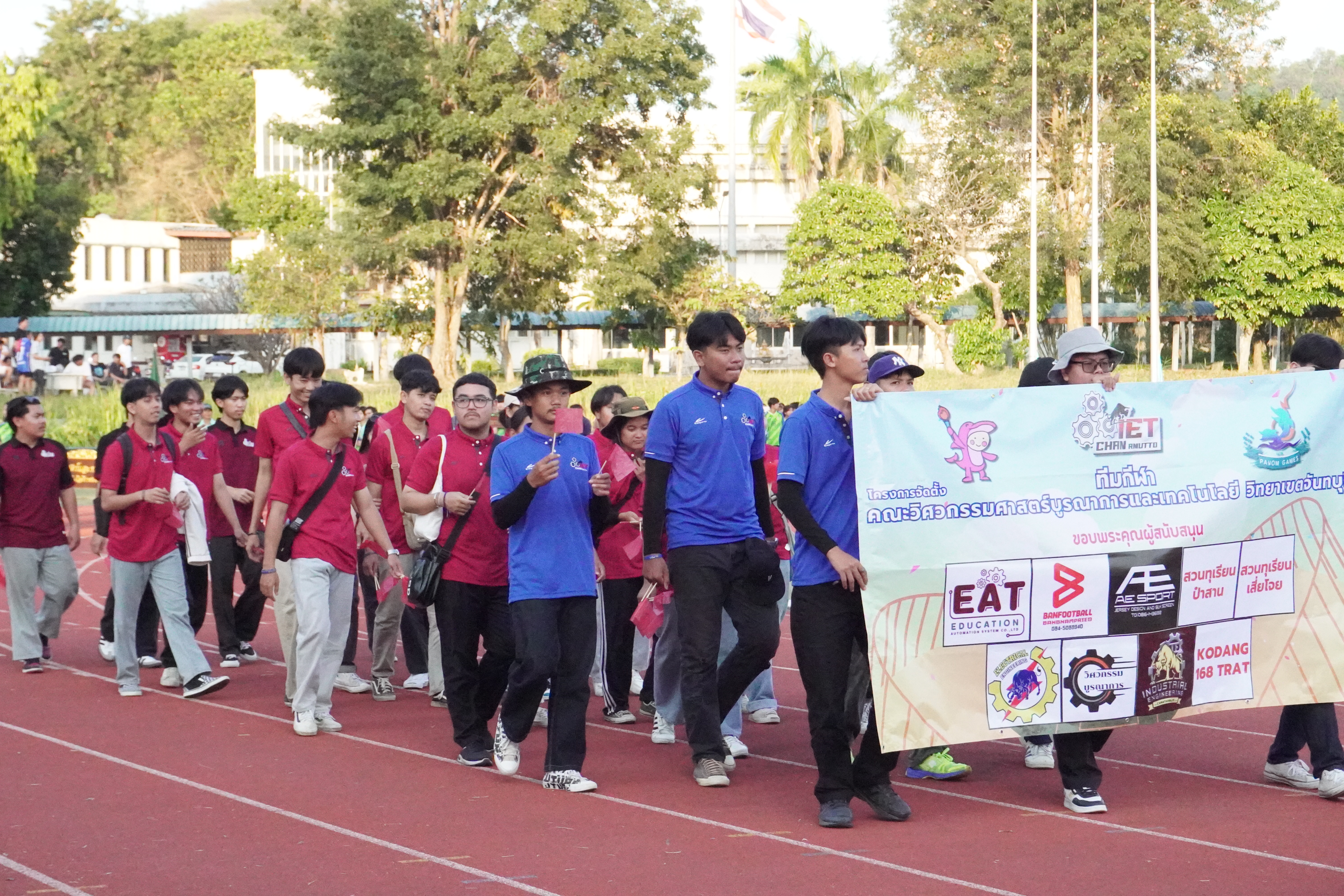 ภาพบรรยากาศทัพนักกีฬาโครงการจัดตั้งคณะวิศวกรรมศาสตร์บูรณาการและเทคโนโลยี วิทยาเขตจันทบุรี ในพิธีเปิดการแข่งขันกีฬาภายในมหาวิทยาลัยเทคโนโลยีราชมงคลตะวันออก "พะยอมเกมส์" ครั้งที่ 16 ประจำปีการศึกษา 2566 ระหว่างวันที่ 13 - 17 ธันวาคม 2566 ณ มหาวิทยาลัยเทคโนโลยีราชมงคลตะวันออก จ.ชลบุรี ในวันพุธที่ 13 ธันวาคม 2566