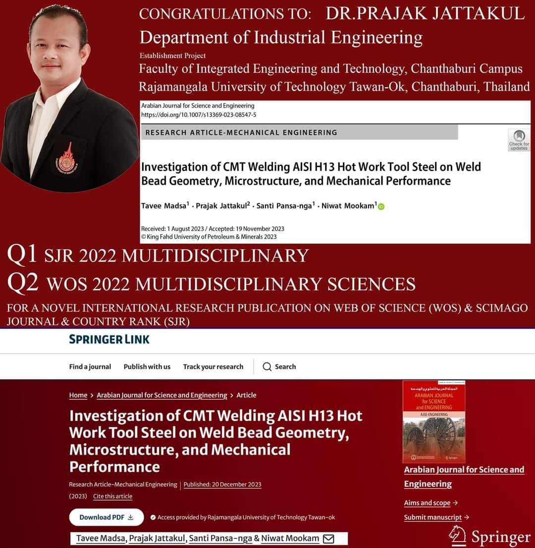 ขอแสดงความยินดีกับ อ.ดร.ประจักร จัตกุล ในโอกาสได้รับการตีพิมพ์เพื่อเผยแพร่ผลงานวิจัยในวารสารวิชาการระดับนานาชาติ Arabian Journal for Science and Engineering