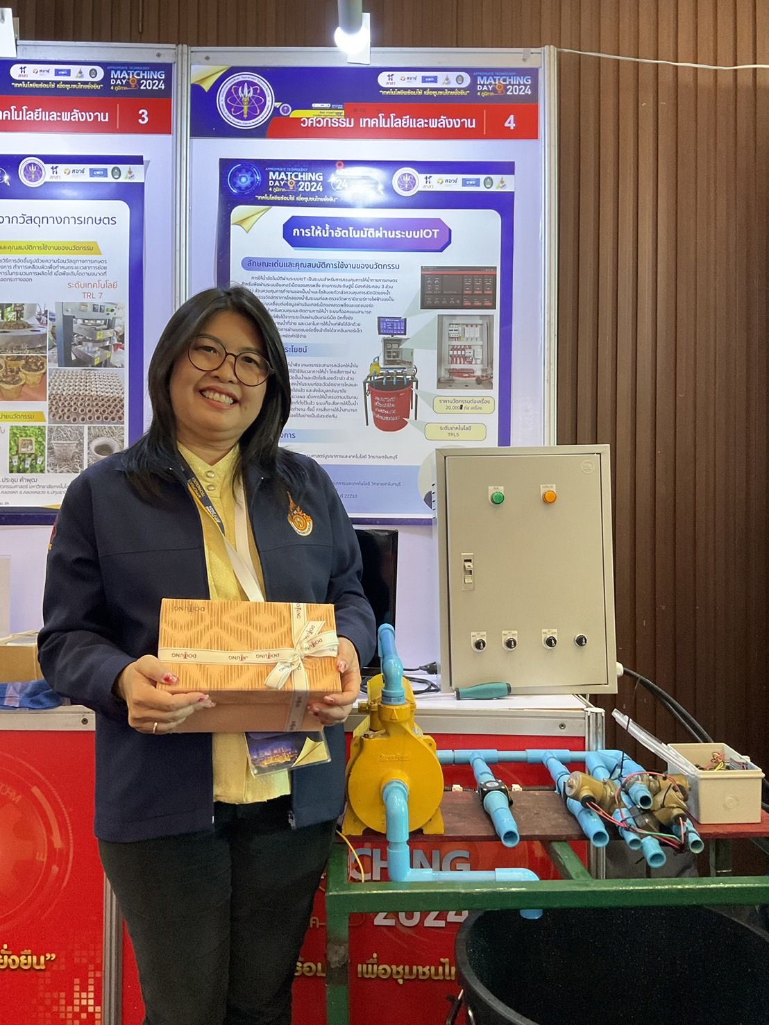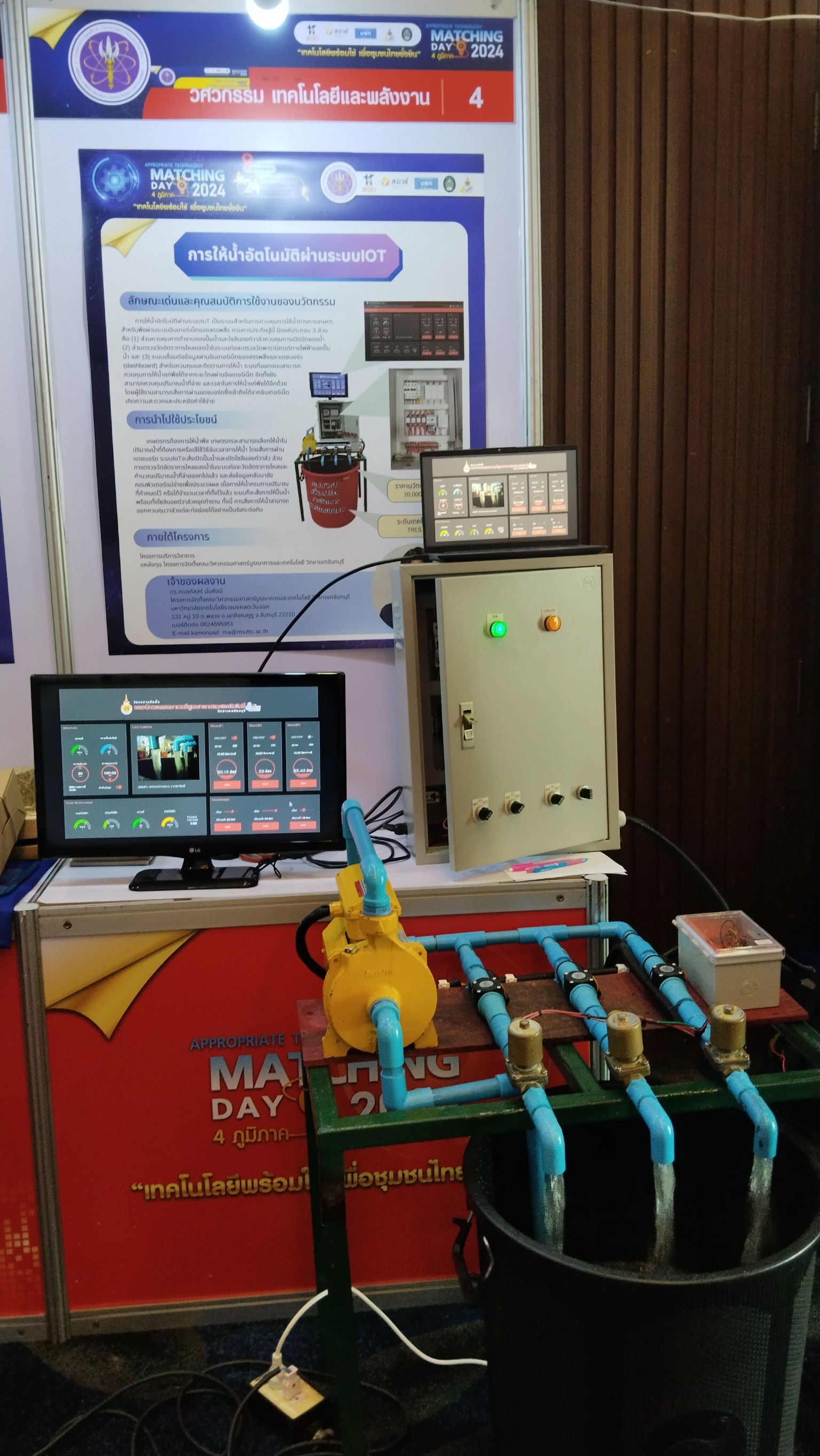 ในวันที่ 23-24 พฤษภาคม 2567 ดร.กมลภัสสร์ มั่นศิลป์ และดร.ฐาปนา นามประดิษฐ์ คณาจารย์โครงการจัดตั้งคณะวิศวกรรมศาสตร์บูรณาการและเทคโนโลยี วิทยาเขตจันทบุรี นำผลงานนวัตกรรมพร้อมใช้ "การให้น้ำอัตโนมัติผ่านระบบ IoT" เข้าร่วมจัดนิทรรศการในงาน Appropriate Technology Matching Day 2024 ณ ห้องประชุม Convention Center โรงแรมรามาการ์เด้น กรุงเทพมหานคร ซึ่งเป็นความร่วมมือระหว่างหน่วยบริหารและจัดการทุนด้านพัฒนาระดับพื้นที่ (บพท.) กับเครือข่ายมหาวิทยาลัยเทคโนโลยีราชมงคล โดยมหาวิทยาลัยเทคโนโลยีราชมงคลตะวันออกได้รับ 2 รางวัล คือ รางวัลดีเด่น 1 รางวัล และรางวัลดี 1 รางวัล ซึ่งโครงการจัดตั้งคณะวิศวกรรมศาสตร์บูรณาการและเทคโนโลยี วิทยาเขตจันทบุรี ได้รับรางวัลด้านวิศวกรรม เทคโนโลยีและพลังงาน "ระดับดีเด่น" ผลงานนวัตกรรม "การให้น้ำอัตโนมัติผ่านระบบ IOT" การให้น้ำอัตโนมัติฝ่ายระบบIOT