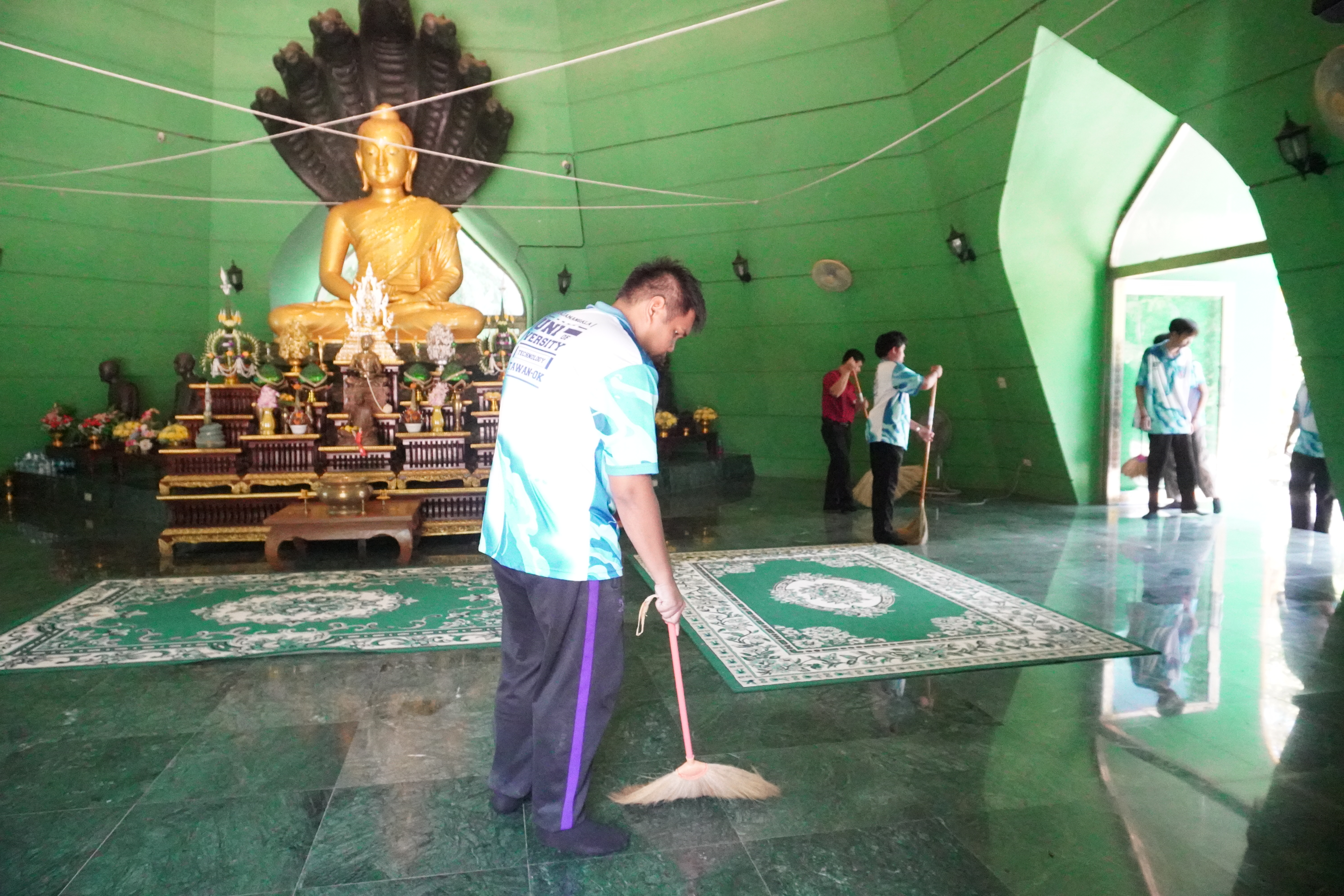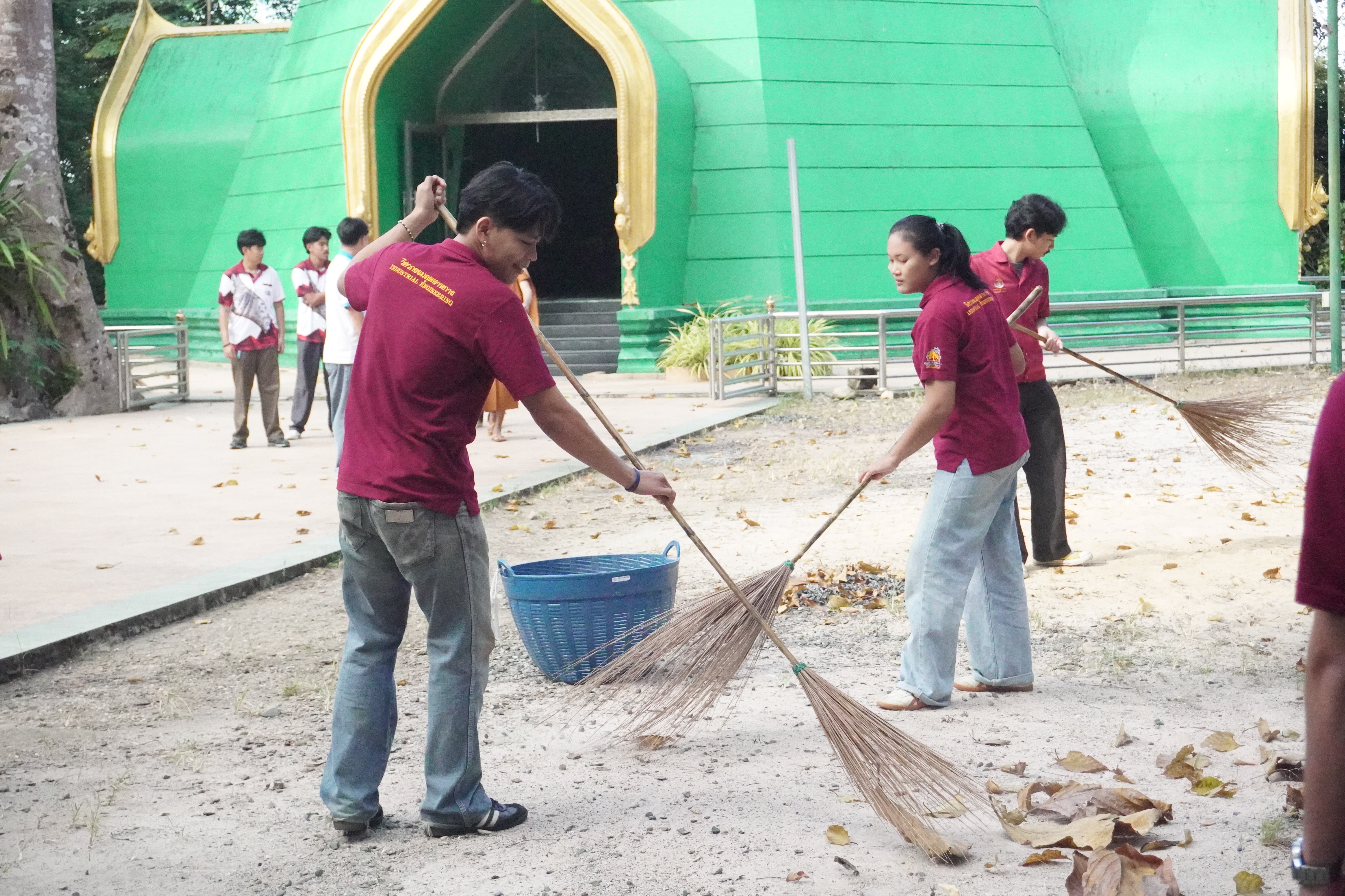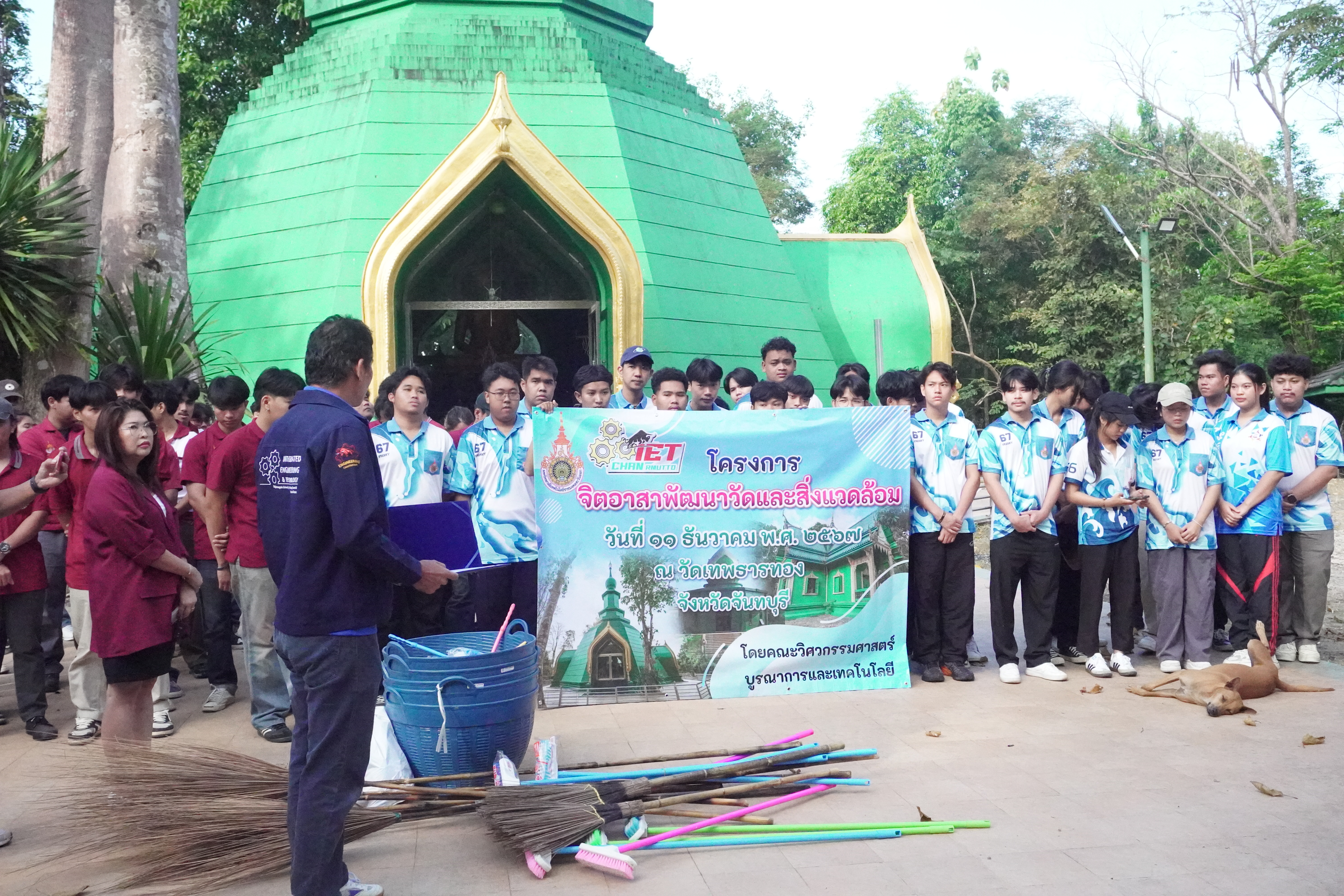 ภาพนักศึกษาคณะวิศวกรรมศาสตร์บูรณาการและเทคโนโลยี ร่วมกันทำจิตอาสาพัฒนาวัดและบริเวณโดยรอบ ได้แก่ กวาดลานวัด เก็บขยะ ทำความสะอาดโบสถ์ และล้างห้องน้ำ