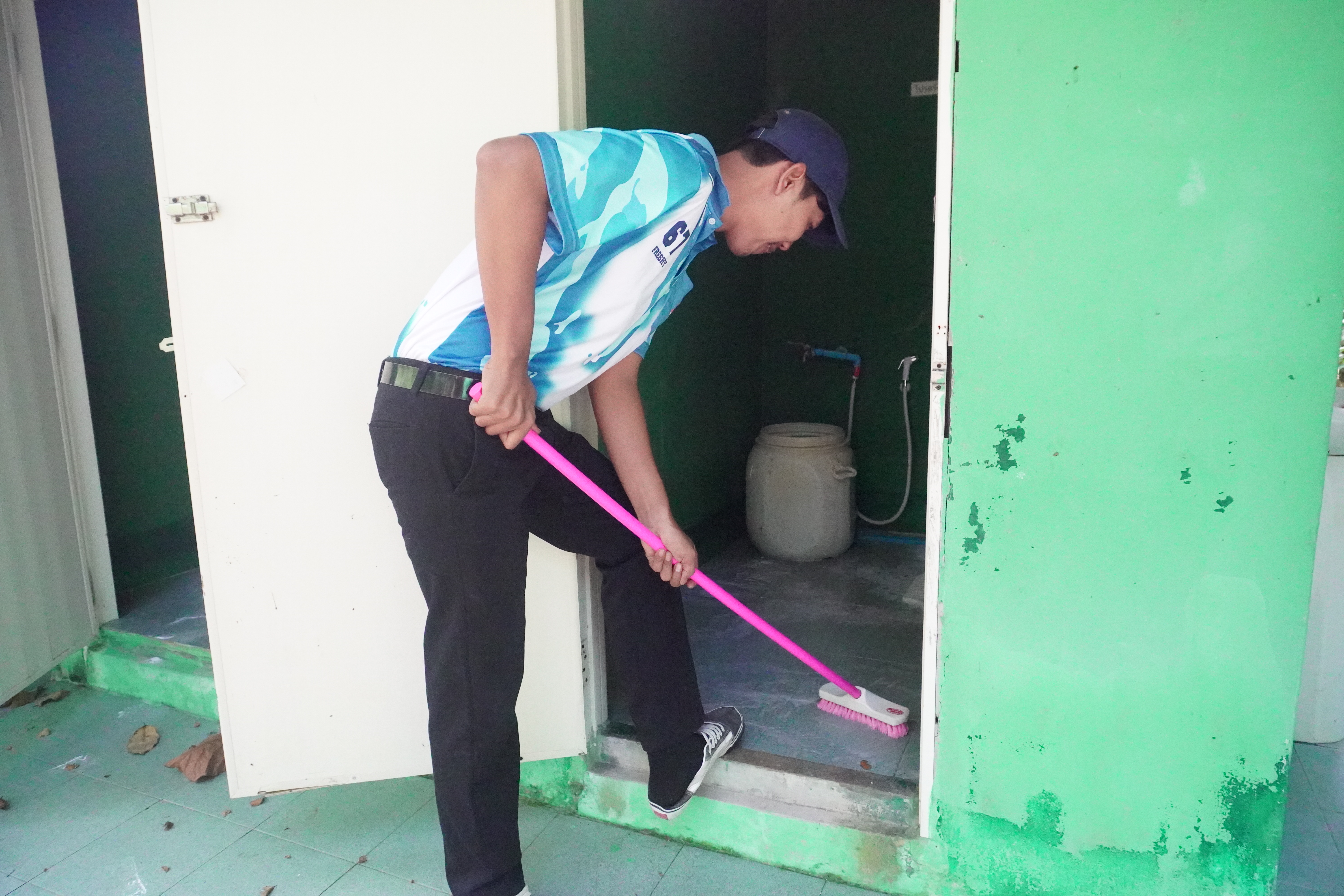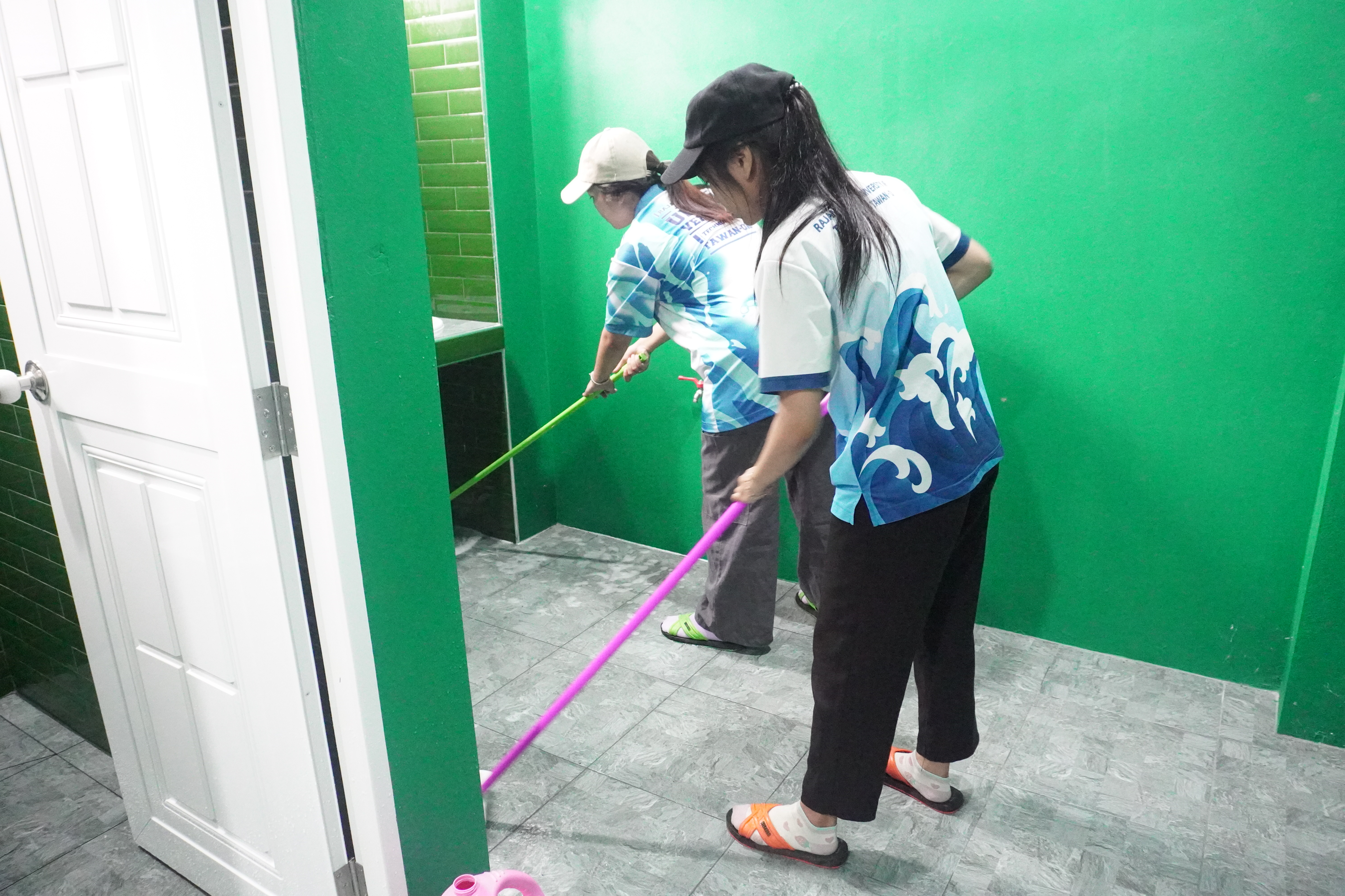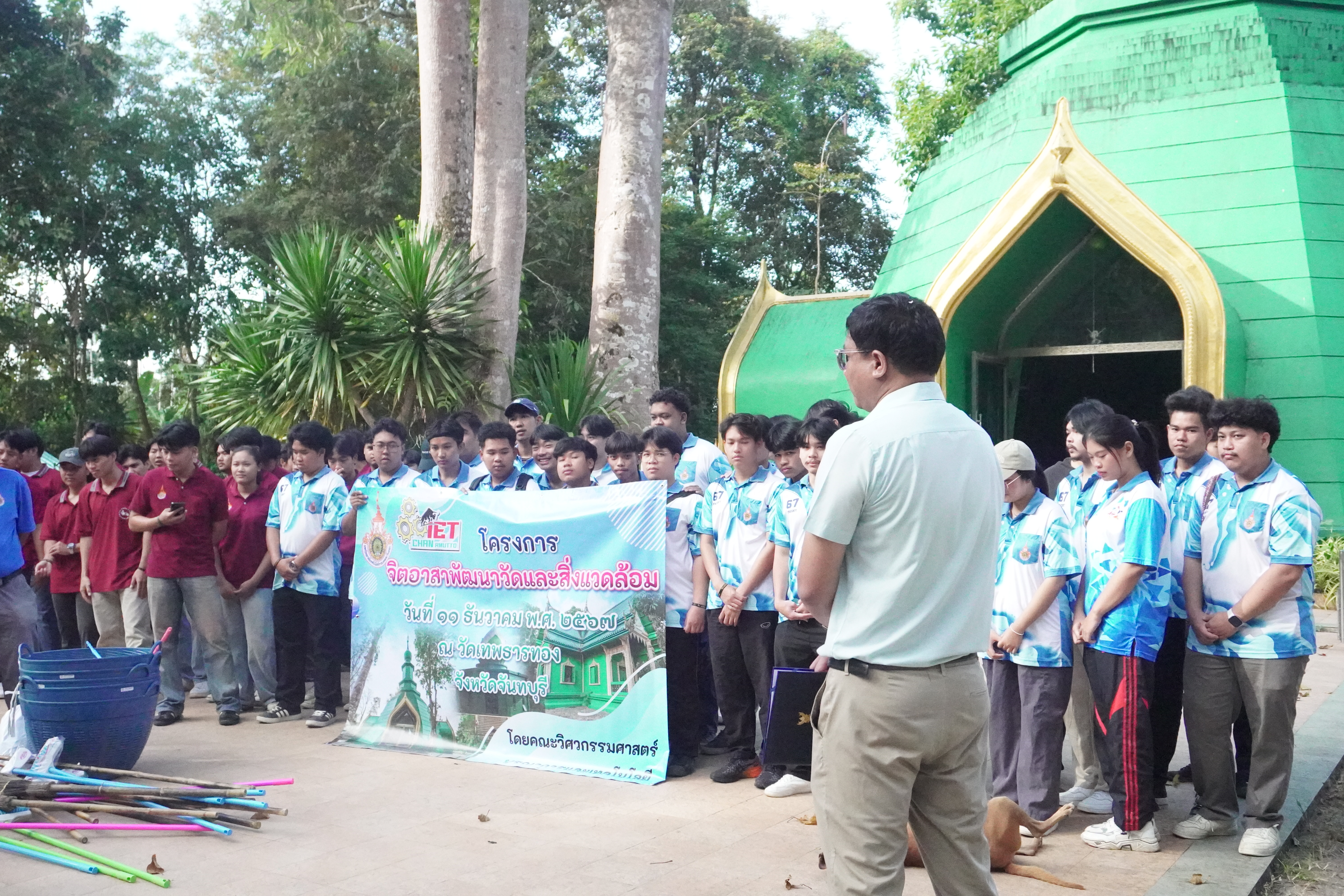 ภาพนักศึกษาคณะวิศวกรรมศาสตร์บูรณาการและเทคโนโลยี ร่วมกันทำจิตอาสาพัฒนาวัดและบริเวณโดยรอบ ได้แก่ กวาดลานวัด เก็บขยะ ทำความสะอาดโบสถ์ และล้างห้องน้ำ