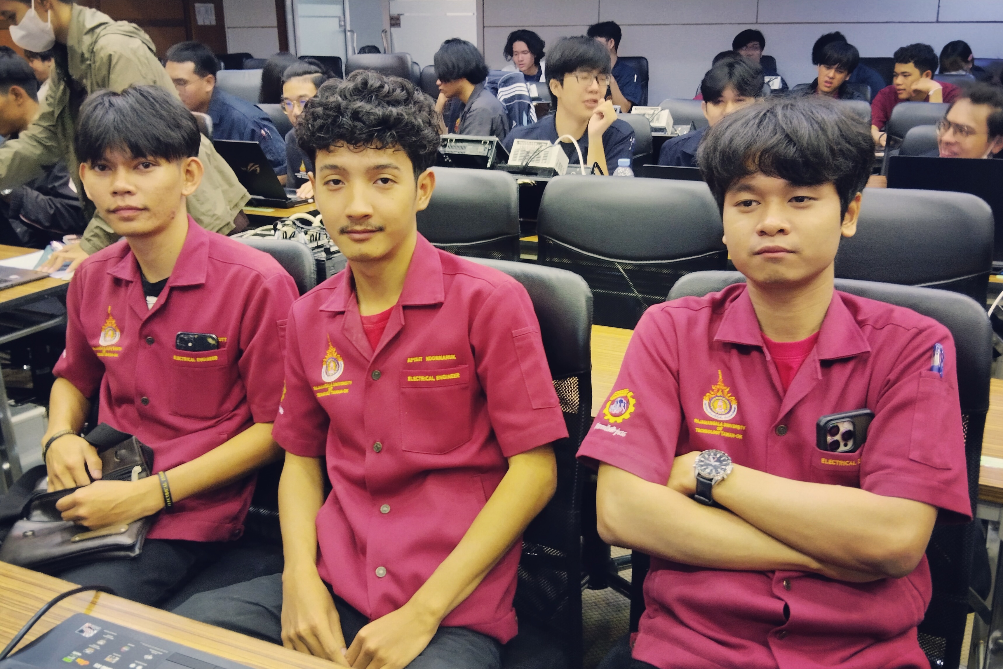 นายอภิสิทธิ์ กุณรักษ์ (อะตอม 3EE4) นายสิทธิกร คร่องยุทธ (เนส 3EE4) นายณัฐพล บุบพะวงษ์ (ฟิวส์ 3EE4) และอาจารย์ที่ปรึกษา ดร.ฐาปนา นามประดิษฐ์