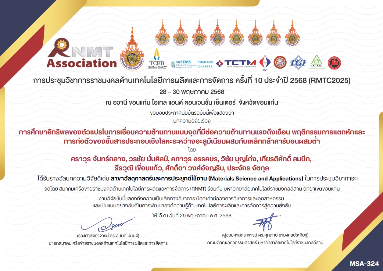 ในการประชุมวิชาการราชมงคลด้านเทคโนโลยีการผลิตและการจัดการ ครั้งที่ 10 ประจำปี 2568 (RMTC 2025) ระหว่างวันที่ 28-30 พฤษภาคม 2568 ณ อวานี ขอนแก่น โฮเทล แอนด์ คอนเวนชั่น เซ็นเตอร์ อ.เมือง จ.ขอนแก่น