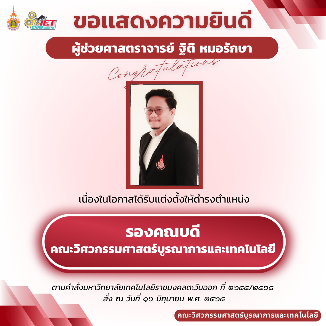 ขอแสดงความยินดีกับ ผู้ช่วยศาสตราจารย์ ฐิติ หมอรักษา เนื่องในโอกาสได้รับแต่งตั้งให้ดำรงตำแหน่ง รองคณบดี คณะวิศวกรรมศาสตร์บูรณาการและเทคโนโลยี