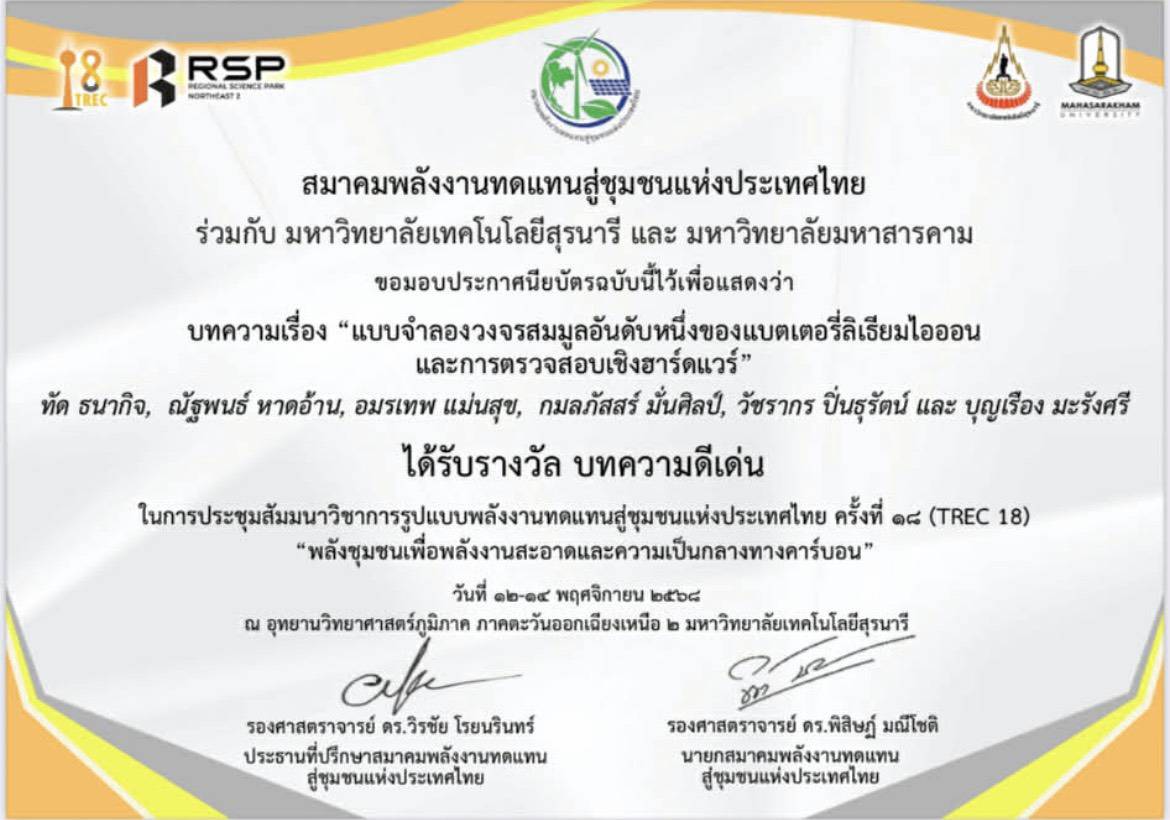 ซึ่งบทความเรื่อง "แบบจำลองวงจรสมมูลอันดับหนึ่งของแบตเตอรี่ลิเธียมไอออน และการตรวจสอบเชิงฮาร์ดแวร์" เป็นส่วนหนึ่งในโครงงานวิศวกรรมไฟฟ้า ของนักศึกษาสาขาวิศวกรรมไฟฟ้า คณะวิศวกรรมศาสตร์บูรณาการและเทคโนโลยี นายทัด ธนากิจ, นายณัฐพนธ์ หาดอ้าน และนายอมรเทพ แม่นสุข